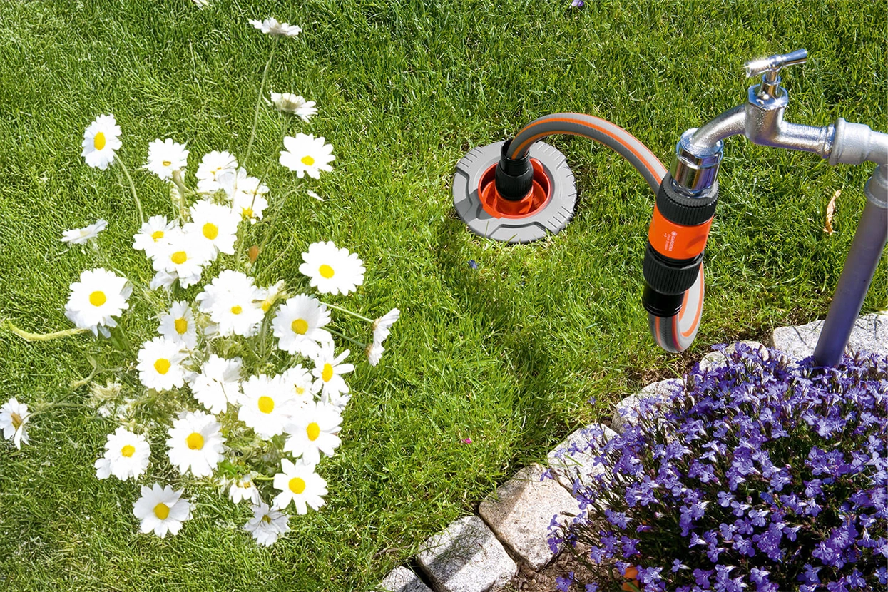 Priključna doza Gardena poveže vir vode s podzemnim zalivalnim sistemom. Navojni priključek Profi System zagotavlja zanesljv pretok vode po potrebah trate in drugih rastlin, ki jih zalivate. Zaradi velikih pretočnih kapacitet omogoča hitro dovajanje vode v sistem. Povezava od pipe do cevovoda zalivalnega sistema je odporna na zunanje vplive in zagotavlja visoko funkcionalno varnost.