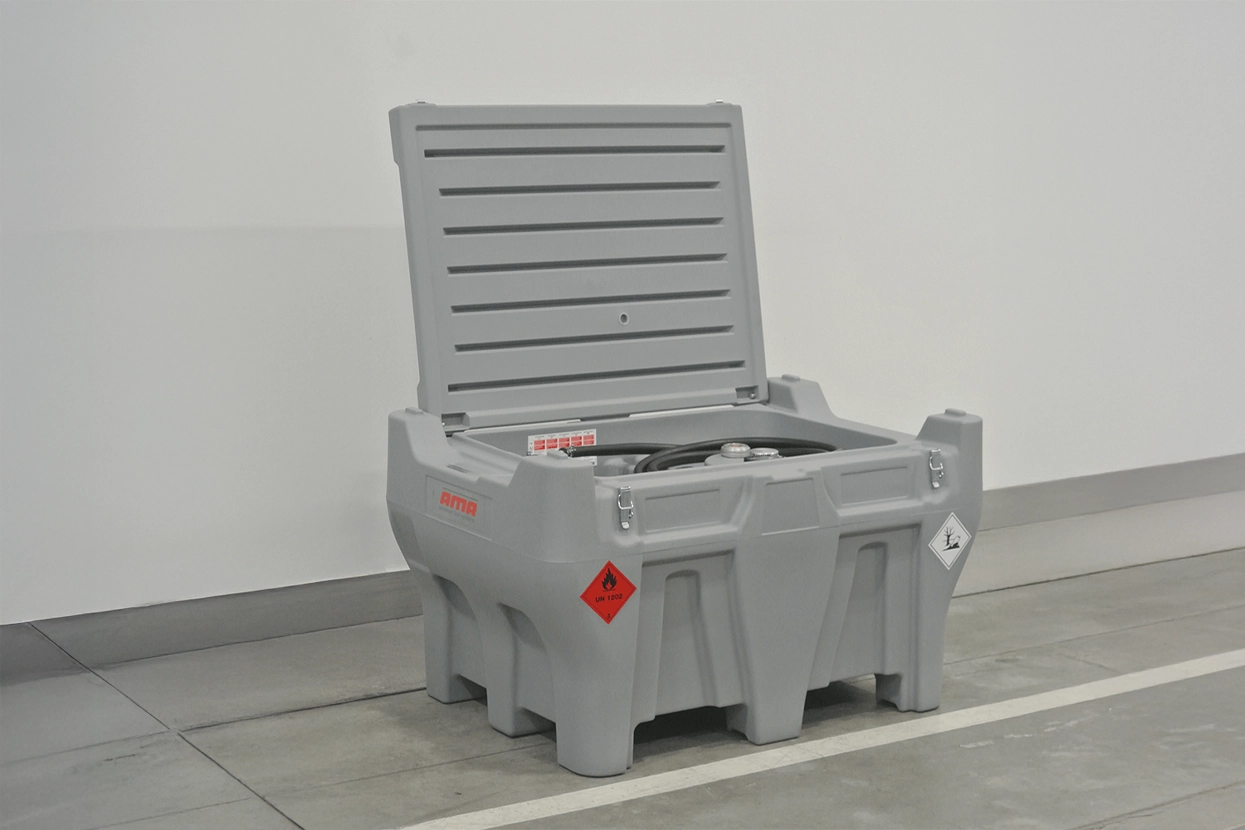 Prenosna posoda za gorivo iz odpornega polietilena. Vsebuje aluminijasti pokrov, avtomatsko pištolo in reže za dvig z viličarjem.